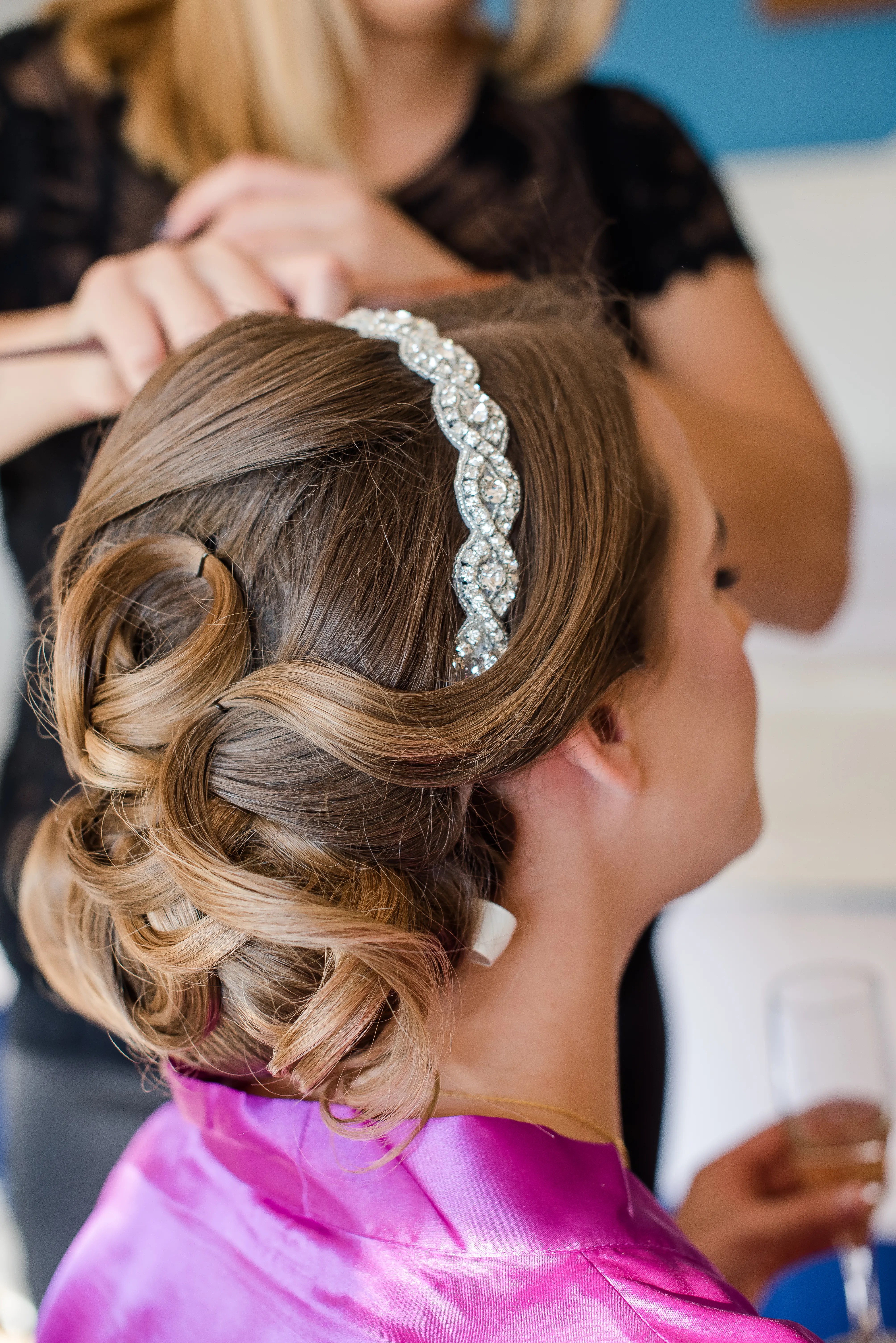 Curled Updo Bridal Hairstyle and Crystal Headband